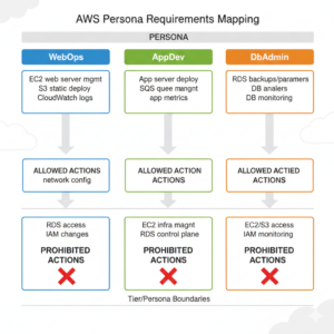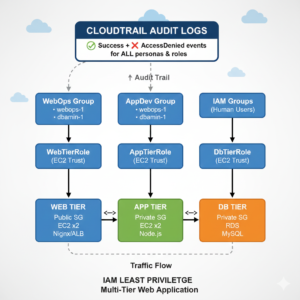 This case study demonstrates the implementation of least privilege access controls across a three-tier web application architecture (Web → Application → Database) using AWS IAM. Building on a previously secured account foundation (Lab 1 case study), this project created human IAM groups and service roles that strictly limit each tier and team persona to only the permissions they need to function, while explicitly blocking cross-tier privilege escalation paths.